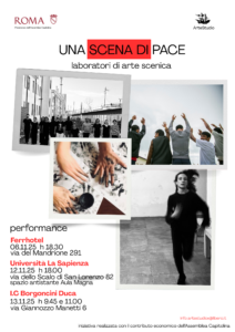 Il progetto, della durata di 12 mesi, prevede un intervento nomade di arte scenica e performativa in varie situazioni della Città: il carcere di Regina Coeli, il centro di neuropsichiatria infantile Policlinico Umberto 1 di Via dei Sabelli, l’Istituto Comprensivo Borgoncini Duca e l’Università La Sapienza – Dipartimento di Studi Europei, Americani e Interculturali.